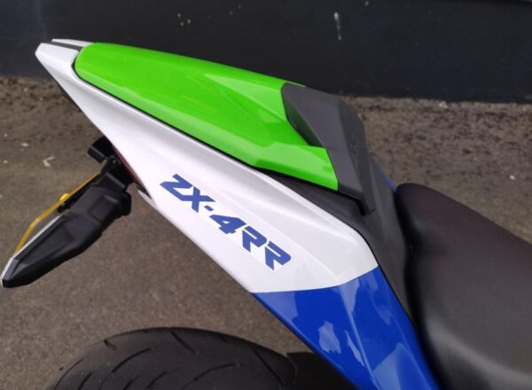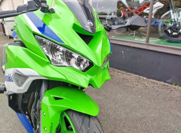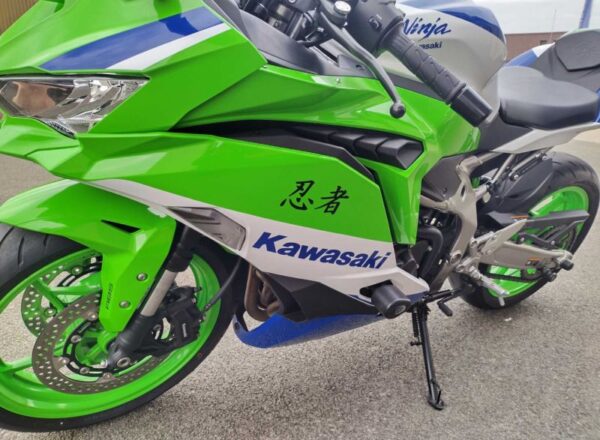 2024 40TH ANNIVERSARY ZX-400RR SRFAN MODEL .VERY LOW MILEAGE EXAMPLE OF KAWASAKI’S REVAMPED 400 RACE REP .THE FOUR CYLINDER MOTOR DEVELOPS 75 hp @ 14,500 rpm & IS MATED TO A WELL SPECCED CHASSIS DEVELOPED FROM THE ZX-10RR SUPERBIKE GEOMETRY, WITH ADJUSTABLE SUSPENSION & RADIAL BRAKE CALIPERS MATED TO 290mm FRONT DISCS.STANDARD FEATURES INCLUDE QUICKSHIFTER, LATEST TFT DASH WITH SMARTPHONE CONNECTIVITY & INTEGRATED RIDER MODES, WITH EASY SET UP FOR ROAD & TRACK.ALL LED LIGHTING & HERITAGE RACE TEAM INSPIRED PAINTWORK. THE SUPPLYING DEALER ALSO FITTED A SEAT COWL, AKRAPOVIC CARBON SILENCER,RADIATOR GUARD, R&G TAILTIDY, CRASH BUNGS & PADDOCK BOBBINS.THIS BIKE WAS £10,250 WHEN NEW. CALL NICK on 01242 583031 for any other information.